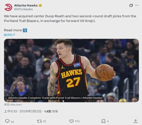 北京時間2月2日上午,亞特蘭大老鷹官方宣布:球隊將前鋒克雷伊奇送到開拓者,1換3交易得到中鋒杜普-裏斯、2027年次輪簽以及2030年次輪簽。裏斯接受右腳應力性骨折手術,已經賽季報銷,老鷹相當於用克雷伊奇換了2個次輪。