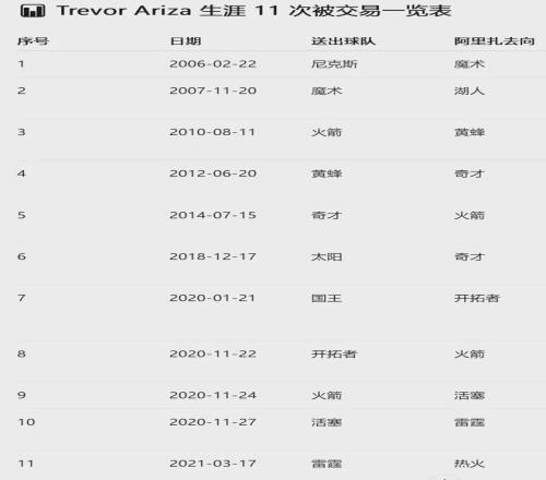 阿裏紮至此已經被交易了7次,接下來才是真正的顛沛流離:2020年11月17日,開拓者將阿裏紮送回火箭;11月19日,火箭又把他送到活塞;11月21日,活塞將阿裏紮送到雷霆。短短四天換了四隊!2021年3月18日,雷霆將其送到熱火。