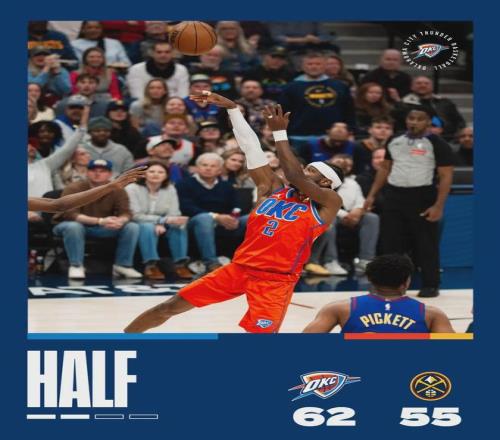 亞曆山大半場7中5獨得15分3板7助3失誤,卡森-華萊士5中3拿到11分。下半場約老師終於開始發力,第三節打了6分鍾,掘金71-74僅落後3分。亞曆山大和華萊士下起三分雨,霍姆格倫大帽約老師和穆雷,雷霆一波15-3拉開到15分以上。