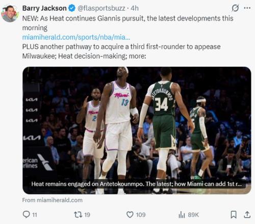 邁阿密熱火隊記者巴裏-傑克遜也透露,熱火隊跟雄鹿隊就揚尼斯的交易一直在協商,他表示潛在的交易是熱火送出泰勒-希羅、克萊爾-韋爾、特裏-羅齊爾、2026年首輪互換權、2029年首輪互換權、2030年首輪簽、2031年首輪互換權、2032年首輪簽。(在威金斯的交易中如果還能獲得一個首輪簽,熱火也願意加上,甚至願意添加更多年輕資產,換言之8換1還在加碼)