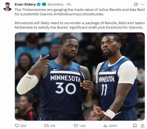 《福布斯體育》記者埃文-斯迪瑞也報道,明尼蘇達森林狼也開始對字母哥競價,為了滿足雄鹿的需求,森林狼已經願意在揚尼斯的交易中納入裏德、蘭德爾、麥克丹尼爾斯等人。