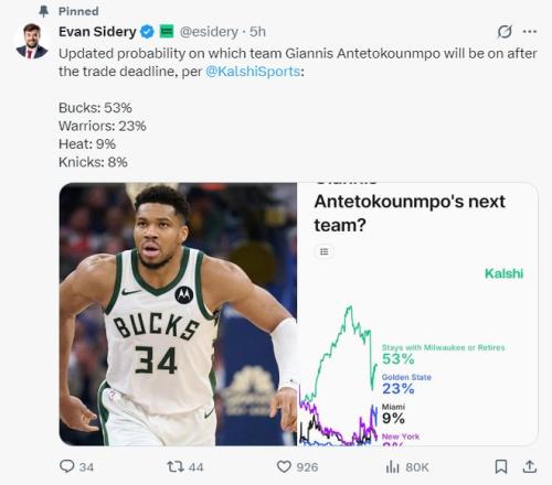 不過最新的揚尼斯下家概率已經更新,交易截止日後留守雄鹿53%最高,勇士23%,熱火9%,尼克斯8%,看起來揚尼斯去哪兒很有可能要延續到休賽期。