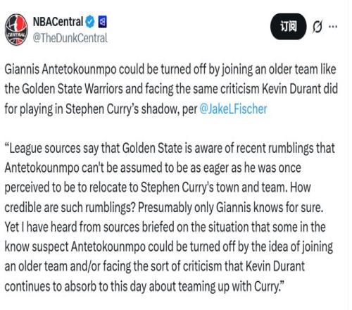 “聯盟消息人士透露,勇士方麵已察覺到近期的一些流言:外界此前默認字母哥會迫切渴望加入庫裏所在的球隊、來到這座城市,但事實可能並非如此。這類流言的可信度究竟有多高?想必隻有字母哥本人最清楚。不過,據知情人士透露,一些圈內人猜測,字母哥或許會打退堂鼓 —— 一方麵是因為勇士陣容年齡偏大,另一方麵則是他不想落得和杜蘭特一樣的下場,至今仍因當年聯手庫裏而飽受詬病。”
