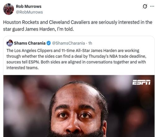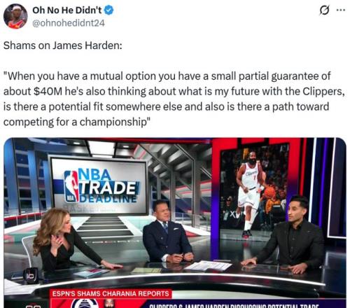 ESPN名記Shams隨後發文確認消息真實性,同時跟進表示哈登與快船雙方都在討論能否在交易截止日前離隊,並且雙方都在尋找感興趣的下家進行討論。