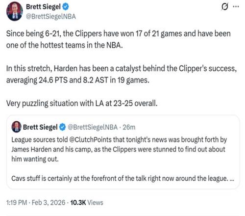 名記Siegel隨後發文確認是哈登與其團隊向球隊管理層提出交易申請,快船隊對此感到很震驚,但還是同意了。