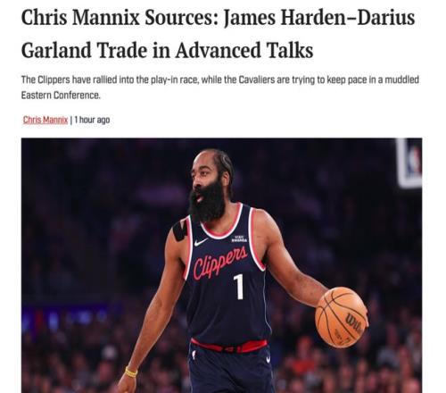 消息最先由《體育畫報》名記Chris Mannix曝出,多位消息人士向其透露,快船與騎士正在圍繞哈登與加蘭互換進行深入討論。