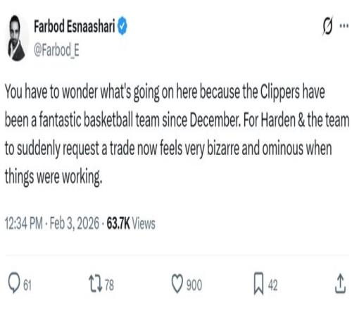 快船隊記Farbod Esnaashari第一時間發文吐槽並表示是哈登團隊提出交易申請,他寫道:“真好奇到底發生了什麽,從去年12月份至今快船隊表現一直非常出色,結果哈登與其團隊突然提出交易申請,這讓人感到費解,也讓人感到有些不安,尤其是一切順利時。”