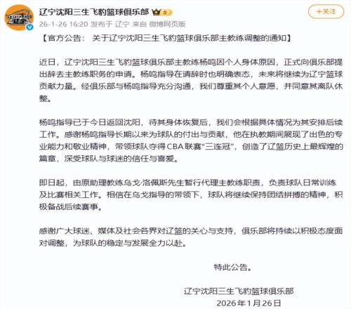 首先是遼寧隊官方發布的公告裏寫著“楊鳴因個人身體原因辭職”。