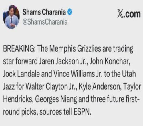 爆料王Shams:灰熊將3J+康查爾+蘭代爾+小文斯-威廉姆斯送至爵士,換回李凱爾+小克萊頓+亨德裏克斯+尼昂+三個首輪簽。