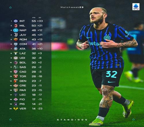 隨著今日淩晨AC米蘭3比0完勝博洛尼亞,意甲第23輪十場比賽全部結束。國際米蘭2比0小勝克雷莫納,繼續以五分優勢領跑聯賽積分榜,米蘭位列次席;那不勒斯2比1力克佛羅倫薩,仍位列歐冠區;羅馬客場1球負於烏迪內斯,將第四的名詞拱手相讓給本輪取得大捷的尤文圖斯,紅狼跌至歐聯席位區,科莫位列歐協聯附加賽區。