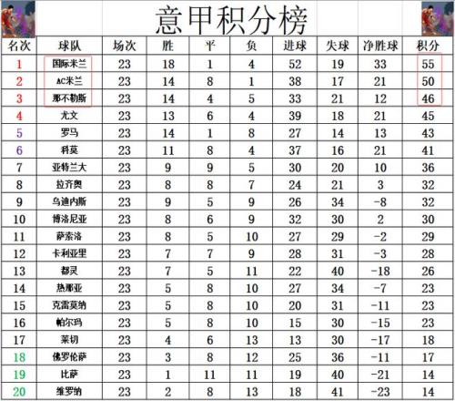 積分榜方麵,本輪前三全部贏球,AC米蘭就還是差國米5分位列第2,那不勒斯落後國米9分排在第3,第4的尤文則是落後國米10分。博洛尼亞慘敗後無力回前8,排在第10。