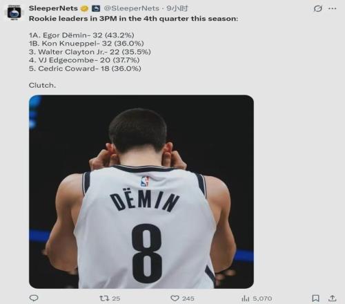 克尼佩爾無疑是三分火力最猛的2025屆新秀,本賽季他已經投進166記三分,高居聯盟第三,僅次於庫裏(175)和米切爾(175)。此外,克尼佩爾本賽季三分命中率42.5%,排名聯盟第19。但是,他在末節的三分命中率不如傑明。