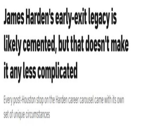 這一次的目的地是克利夫蘭——在快船的征程未能如願後,在與費城不歡而散後,在布魯克林短暫停留後。頻繁改換門庭、季後賽早早出局,這些都將成為哈登職業生涯履曆中無法抹去的印記。單從紙麵來看,他離開火箭後的這段生涯軌跡,確實難逃外界的詬病。