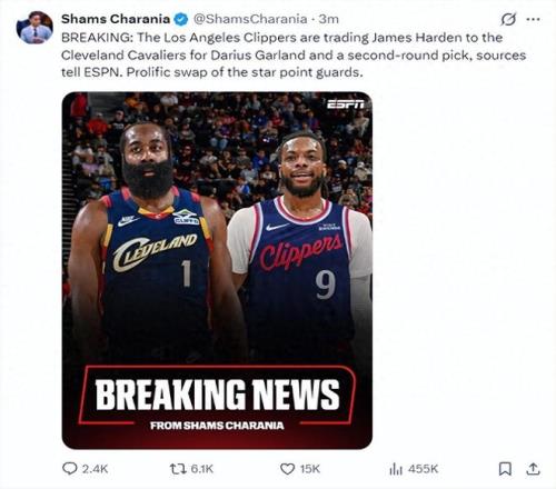 NBA交易市場在北京時間2月4日迎來重磅消息:洛杉磯快船隊與克裏夫蘭騎士隊達成交易,快船送出詹姆斯·哈登,從騎士換回達裏厄斯·加蘭和一個2026年的次輪選秀權。