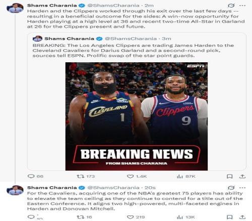 交易完成後,騎士隊的潛在首發陣容預計為:詹姆斯·哈登、多諾萬·米切爾、傑隆·泰森、埃文·莫布利和賈勒特·阿倫。