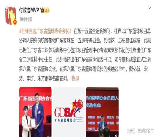 而憑借著去年全運會幫助廣東隊奪冠,杜鋒也成為了最大的功臣。在他負責的籃球項目中,廣東隊四奪金牌,憑借著這一曆史最佳戰績,杜鋒成功當選第6屆廣東省籃球協會會長。至此,作為廣東隊曆史上最成功的球員之一,杜鋒又有了一個全新的身份。在杜鋒當選廣東省籃協會長後,不少廣東球迷也開始給杜鋒送祝福了。不過,也有廣東球迷建議,杜鋒應該盡快想辦法,把深圳隊的賀希寧和王浩然“忽悠”到廣東隊。