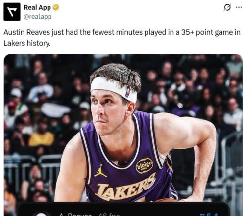 憑借這樣的表現,裏夫斯成為湖人隊史單場拿下35+得分用時最少的球員。
