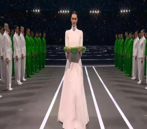 在國歌聲中,意大利時裝模特維多利亞·切雷蒂(Vittoria Ceretti)代表東道主意大利在米蘭舉著意大利國旗亮相。