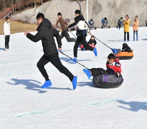 2026年1月17日,湖北襄陽,冰雪嘉年華活動上,人們參加親子雪圈賽跑。視覺中國 圖