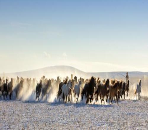 2026年1月10日,內蒙古烏拉蓋管理區,第三屆冰雪文旅主題活動開幕,萬馬在雪域高原上奔騰。視覺中國 圖
