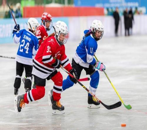 2026年1月25日,呼和浩特市大眾冰雪季冰雪戰隊聯賽活動現場,冰雪愛好者在冰球比賽中展開激烈角逐。視覺中國 圖