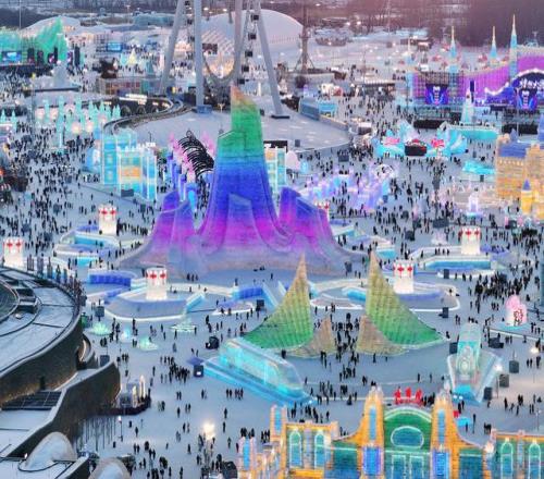 2026年1月27日,黑龍江省哈爾濱市,夜晚的冰雪大世界流光溢彩,宛如夢幻仙境。視覺中國 圖