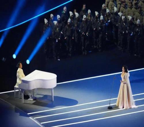 中國鋼琴家郎朗(左)和意大利歌唱家巴托莉在開幕式現場表演