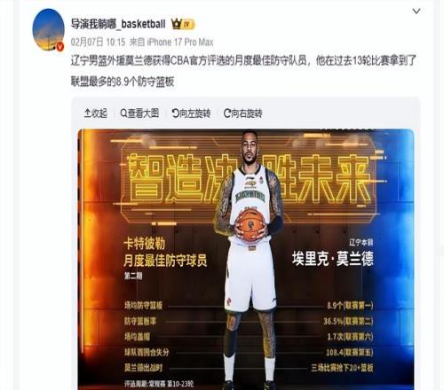 2月7日,CBA官方發布正式官宣,遼寧男籃的內線球員莫蘭德,當選為2025-2026賽季CBA聯賽第二期月度最佳防守球員。不得不說,香蕉视频网址理應向莫蘭德表示祝賀。莫蘭德身高兩米零八,在內線領域,他的防守意識和防守能力都堪稱CBA聯盟頂級水準,而且本賽季他始終保持穩定高效的發揮,用實力為球隊保駕護航。