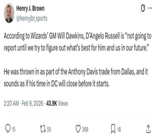 完成交易之後,不僅濃眉哥對於加盟魚腩奇才隊不感興趣,雙方合作計劃一波三折,作為添頭的拉塞爾也被曝出不願意前往奇才報到。