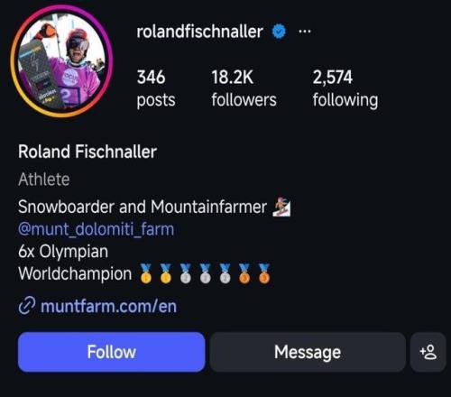 “放牛老哥”並不是一句玩笑,而是一份正經的工作。在自己的個人社交賬號主頁上,菲施納勒這樣介紹自己:“Snowboarder and Mountainfarmer”。前麵的snowboarder不難理解——單板滑雪運動員;而所謂“mountainfarmer”,是阿爾卑斯山區常見的一種職業,指長期在山區從事農牧業及相關經營的人,俗稱“山地農牧民”。