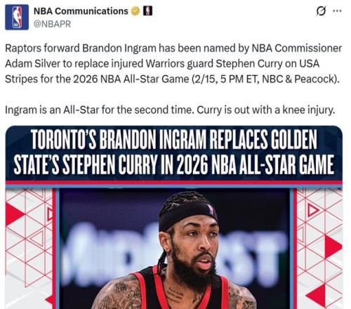 最終NBA官方宣布,總裁蕭華指定英格拉姆入選全明星,替代因膝傷缺席全明星的庫裏,代表美國隊參賽。