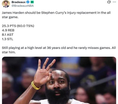 火箭媒體人Bradeaux也呼籲聯盟挑選哈登入選,並且給出兩大原因,第一點是36歲的哈登依舊保持著頂級比賽影響力,場均拿下25.3分4.9板8.1助1.3搶斷,真實命中率60%,第二點是哈登幾乎不缺席比賽,理應入選全明星。