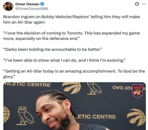 對此英格拉姆本人自然也十分開心,接受采訪時笑著說道:“我對加盟多倫多的決定感到滿意,這極大得提升了我的比賽水平,尤其是在防守端,拉賈科維奇一直在督促我變得更好,我在這裏有足夠的空間展示能力,並且認為自己正在不斷進步,能夠入選全明星陣容是一項了不起的成就,一切榮耀歸於上帝。”