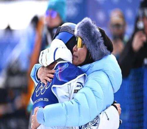 2月9日,穀愛淩(左)在完成第一跳後和媽媽擁抱。新華社記者 張宏祥 攝