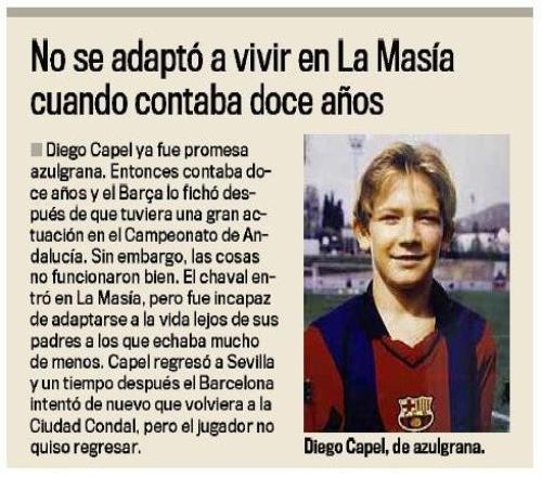 迭戈-卡佩爾1988年2月16日出生於阿爾梅裏亞的阿爾波什,出道於家鄉球隊奧盧拉青訓營。2000年時,巴塞羅那從奧盧拉帶走了卡佩爾,不過僅僅過了半年,卡佩爾就因為抑鬱回到了奧盧拉。此後,卡佩爾還曾在東方體育以及塞維利亞接受過足球培訓。