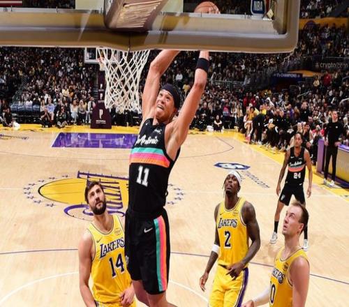 末節,克內克特拋投得分,奧利尼克上籃得分。蒂米三分命中,蒂耶羅扣籃2+1,蒂米又連得4分,把分差縮小到21分。約翰遜扣籃,麥克勞克林三分命中,奧利尼克上籃得分,麥克勞克林搶斷得分,馬刺回敬一波9-0。布朗尼三分命中,卡特-布萊恩特中投得分。布朗尼拋投命中,哈珀上籃得分。最終,馬刺輕鬆擊敗湖人,拿下5連勝。