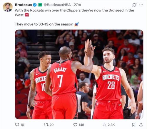 此役後火箭拿到33勝19負升至西部第三(掘金34勝20負掉到西部第四),火箭隊在不知不覺重返西部前三,他們距離西部第二的馬刺還有3個勝場差。