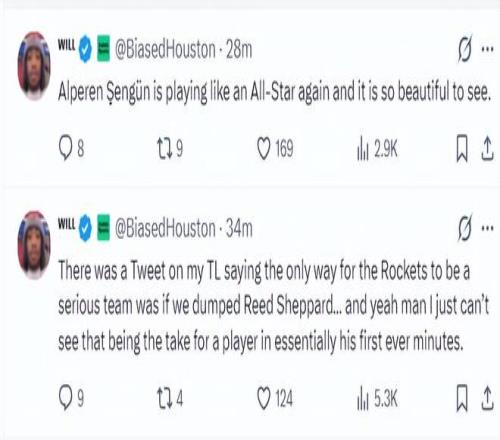 隨後他還寫道:申京現在又表現的像一位全明星球員了,看到這一幕真的太美妙了。此前還有人建議火箭放棄謝潑德,他們認為隻有放棄謝潑德火箭才能成為強隊,夥計們我真的無法想象在生涯前兩個賽季就被放棄的高順位球員。