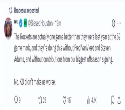 外界對37歲的杜蘭特誤解太多,實際上他場均36.7分鍾聯盟第三,他場均25.9分也是火箭得分最高,命中率51%、三分命中率40.4%,罰球命中率87.8%,他進攻效率120.5聯盟第31,這樣的杜蘭特怎麽會讓火箭變得更糟?