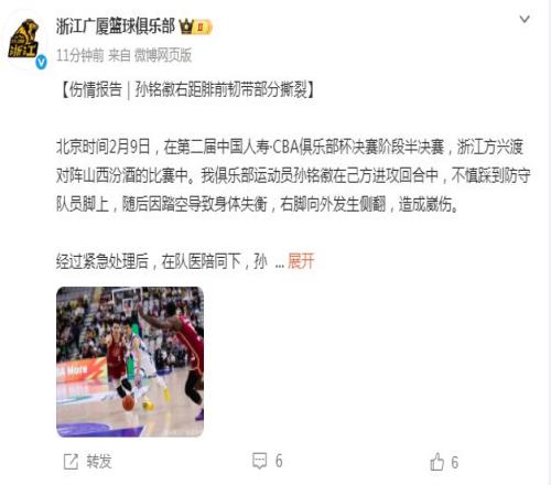 北京時間2月11日,衛冕冠軍浙江廣廈官方公布球隊核心孫銘徽的傷病報告,他遭遇右距腓前韌帶部分撕裂,右踝內側三角韌帶、跟腓韌帶損傷,預計傷停6-8周。孫銘徽的受傷對於廣廈影響極大,很可能會導致他們丟掉常規賽第一排名,也會對本賽季的衛冕前景造成影響。