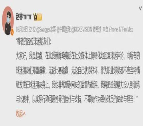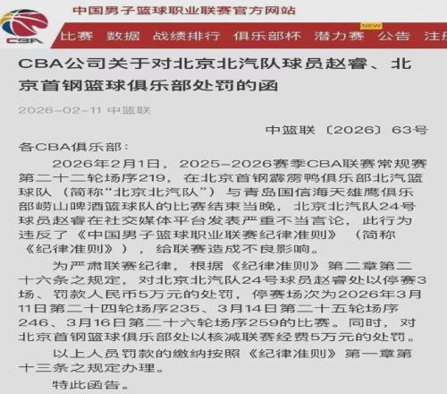 CBA官方宣布:由於趙睿發表嚴重不當言論,禁賽三場以及罰款五萬......