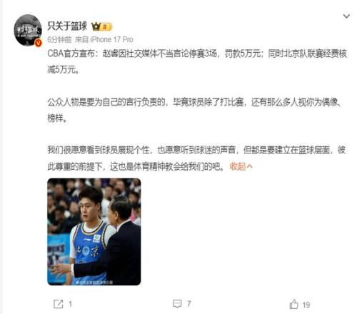 北京時間2月11日晚,CBA公司官方宣布對北京男籃球員趙睿進行處罰,趙睿因為在社交媒體發布嚴重不當言論被處以停賽三場、罰款5萬元。