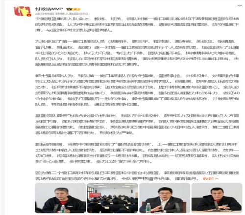 中國男籃的集訓入隊會上,郭振明表示‘中男籃已經到了最危險的時候’,上一個窗口期的二連敗讓球隊在世界杯出線形勢極度被動,後續的比賽不容有失,需要全體人員認清形勢放棄一些幻想,把每一場比賽當最後一場去拚。