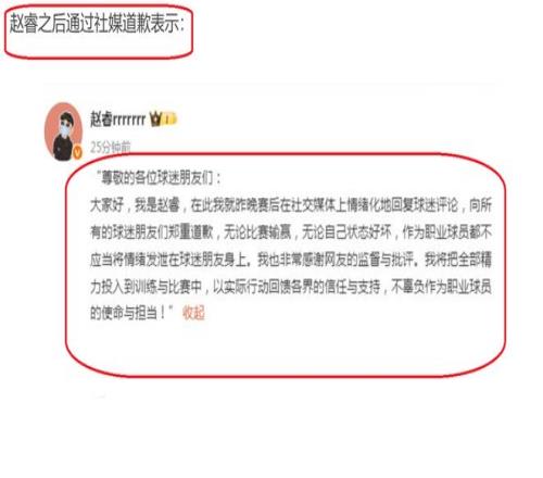 後來,趙睿也是認識到了自己的問題,於是就通過網絡平台,向球迷進行道歉,表示自己在輸掉比賽之後,情緒化地回應了球迷的評論,很不應該,特地向球迷進行道歉!自己作為一名職業籃球運動員,不管是任何情況下,都不能夠將自己的情緒發泄到球迷身上。接下來,自己也會反思,會將所有的精力用在訓練和比賽上,同時,也是感謝球迷的監督和批評。