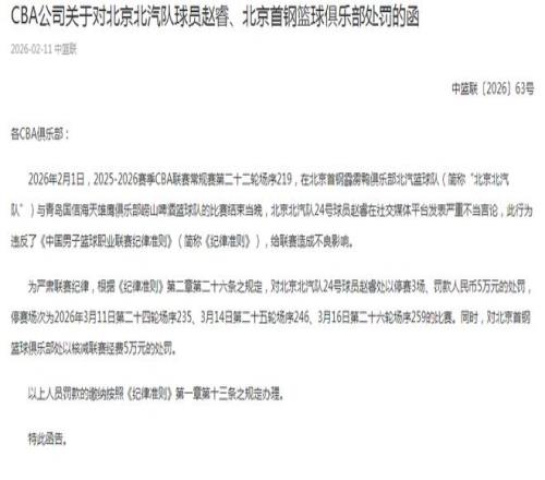 為嚴肅聯賽紀律,根據《紀律準則》第二章第二十六條之規定,對北京24號球員趙睿處以停賽3場、罰款5萬元的處罰,停賽場次為2026年3月11日第二十四輪場序235、3月14日第二十五輪場序246、3月16日第二十六輪場序259的比賽。同時,對北京首鋼籃球俱樂部處以核減聯賽經費5萬元的處罰。