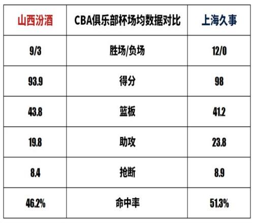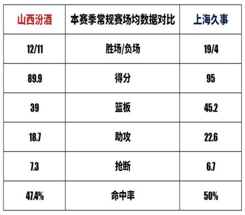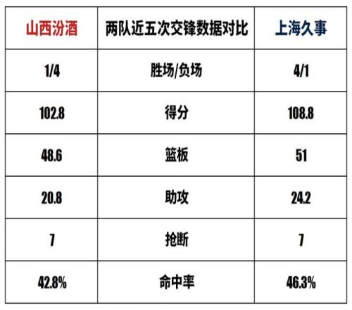 山西汾酒與上海久事在CBA俱樂部杯曆史上共交手1次,山西汾酒0勝1負;兩隊在CBA聯賽曆史上共交手45次,山西汾酒21勝24負,本賽季兩隊交手1次,山西汾酒0勝1負。