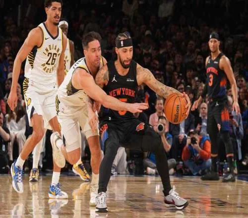 尼克斯上一場客場111-89大勝凱爾特人,步行者過去4場連輸火箭、爵士、雄鹿與猛龍遭遇4連敗,本賽季首次交鋒尼克斯客場114-113險勝步行者。本場尼克斯缺少阿奴諾比、麥克布萊德與羅賓遜,步行者缺少祖巴茨、哈利伯頓、托平等。首節開局尼克斯9-3領先,並在之後維持12-5領先,步行者一波8-0攻勢反超,尼克斯纏鬥至14-16落後。尼克斯內外開花一波8-0攻勢反超,西亞卡姆與內姆哈德連續得分,尼克斯26-27被反超。雙方繼續交替領先纏鬥,首節結束尼克斯33-32領先步行者。首節步行者三分17中7,西亞卡姆7中4得到10分;尼克斯三分9中3,布倫森8中4得到11分。