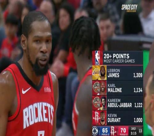 至於在現役球員當中,杜蘭特1000場得分20+排在現役第二,僅次於詹姆斯的1309場紀錄,杜蘭特想要超越基本沒有希望。