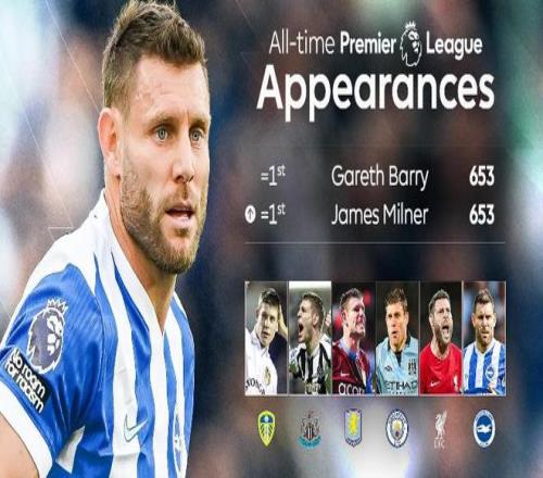 此役客場對陣維拉,米爾納在比賽第22分鍾替補登場,這位40歲的英格蘭中場迎來英超生涯第653次出場,這使得他追平了巴裏保持的英超曆史出場紀錄。