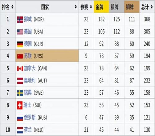 (冬奧會曆史獎牌榜,圖:Wiki)▼
